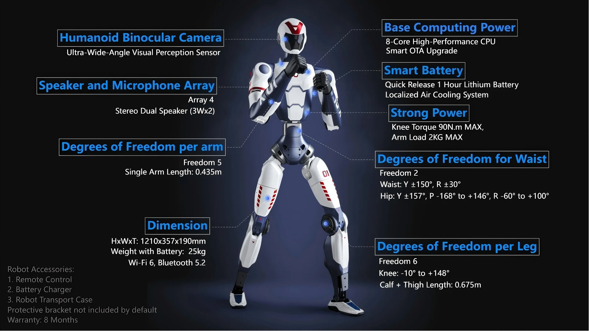 Features Wi-Fi 6, Bluetooth 5.2, speaker, microphone array, and humanoid binocular perception cameras for real-time environmental interaction.