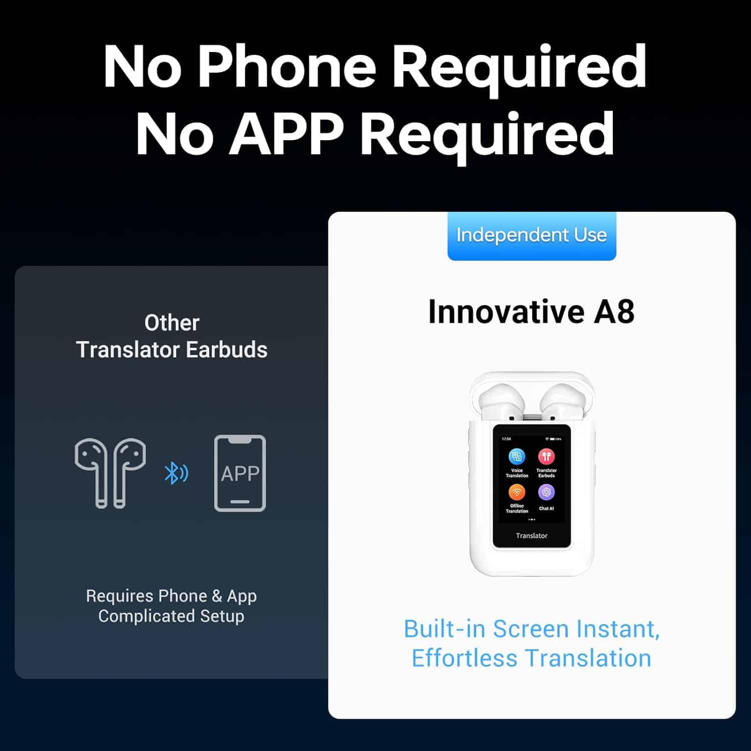 No need to connect to your phone or download an app for translation! Unlike most translation earbuds, A8 operate independently for translation. Also, they can serve as traditional Bluetooth earbuds to connect to your phone for music or calls.