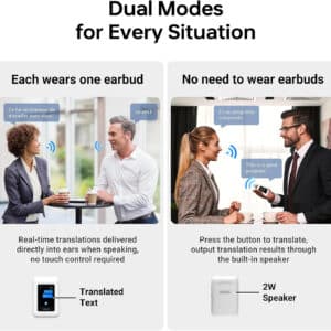 Earbud Mode requires both parties to wear the earbuds for seamless, hands-free communication. Speaker Mode allows translations to be broadcast from the charging case’s speaker, making it ideal for group discussions or noisy environments.