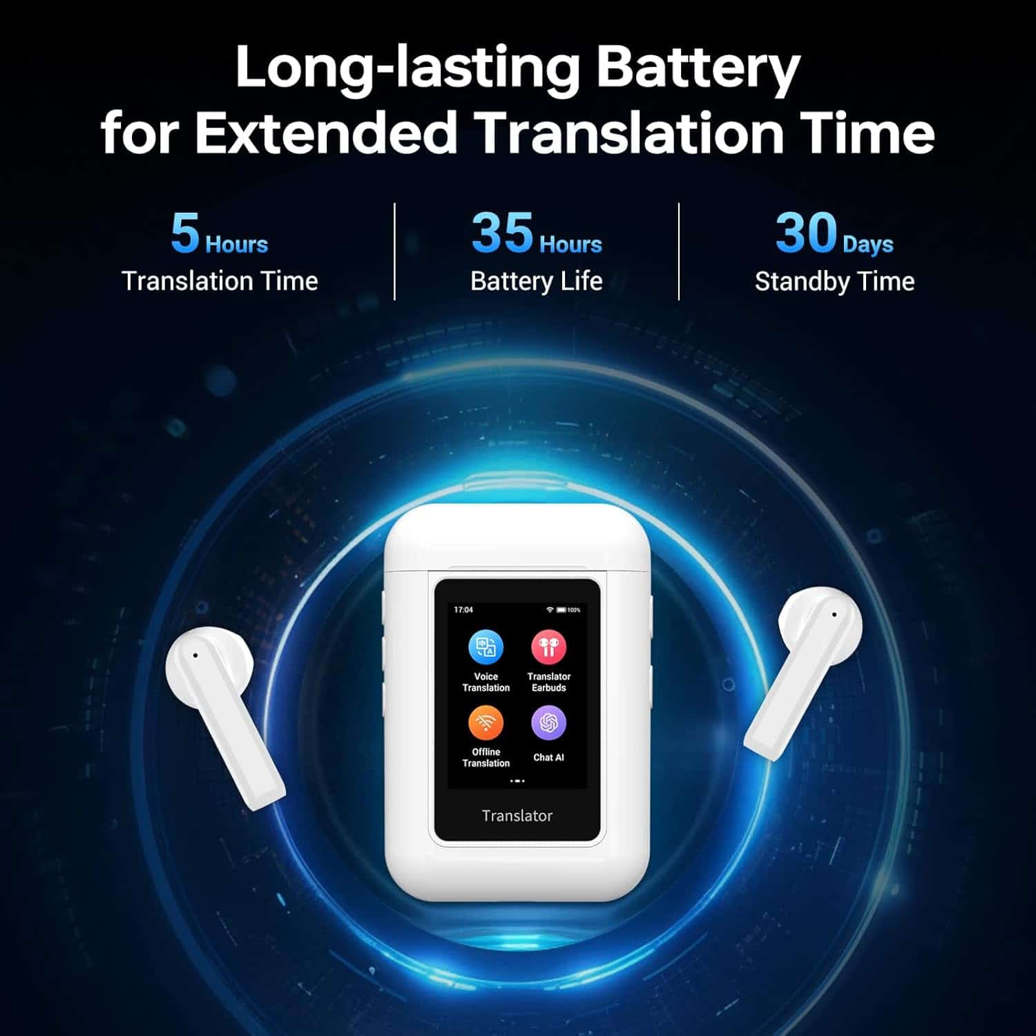 Stay powered all day with up to 35 hours of continuous translation or 30 days on standby. The A8 fully recharges in just 1.5 hours, ensuring dependable performance wherever you go. Weighing only 90 g, it’s designed for portability and convenience.