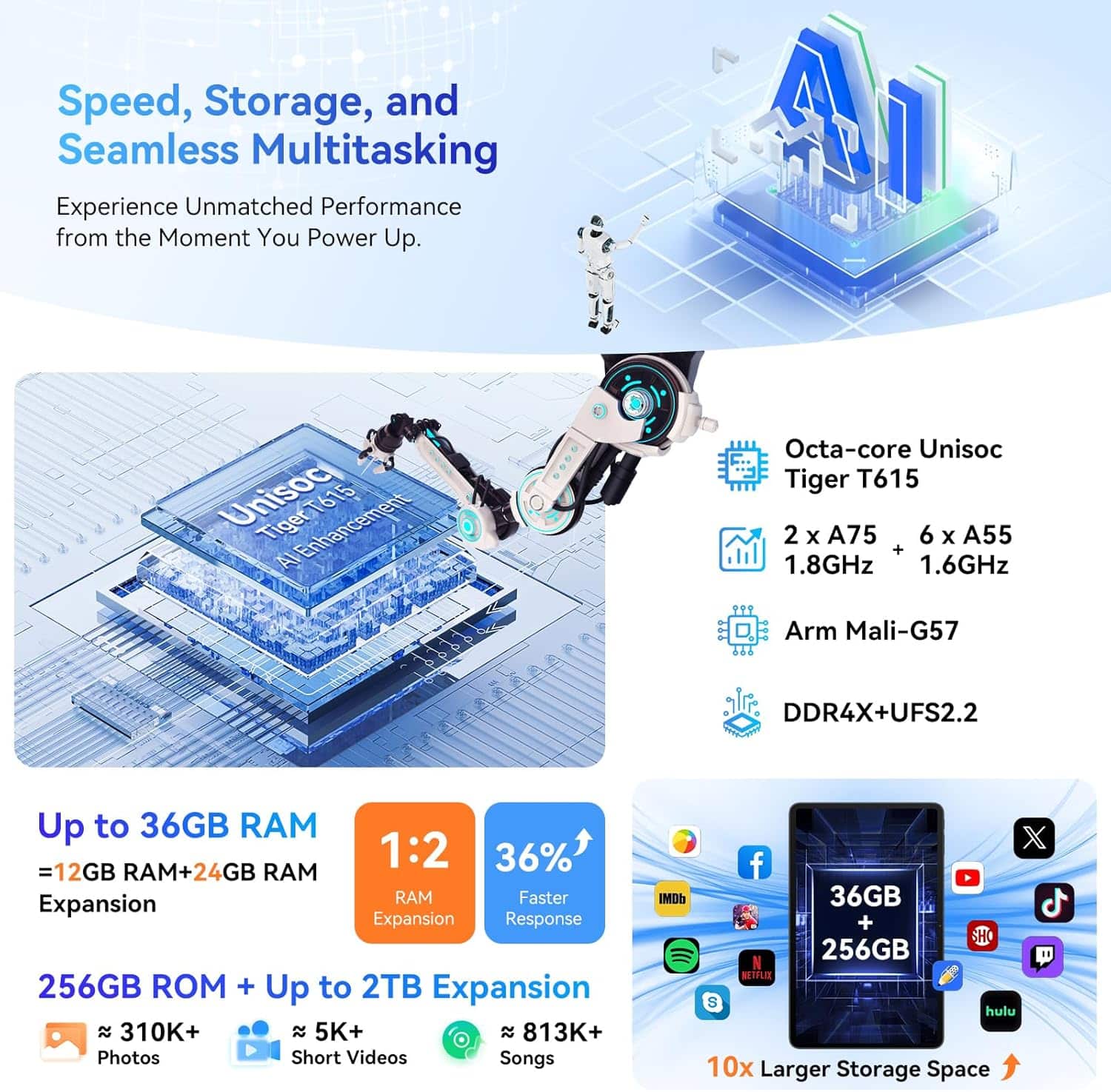 Experience next-generation performance with the OSCAL 8MP AI Camera Tablet, engineered for creativity, productivity and entertainment. Powered by Android 15 and the high-performance Unisoc T615 octa-core processor, this tablet offers seamless multitasking, smooth app performance and lightning-fast response. With 36GB of RAM and 256GB storage expandable to 2TB, it’s built for professionals, students and creators alike.