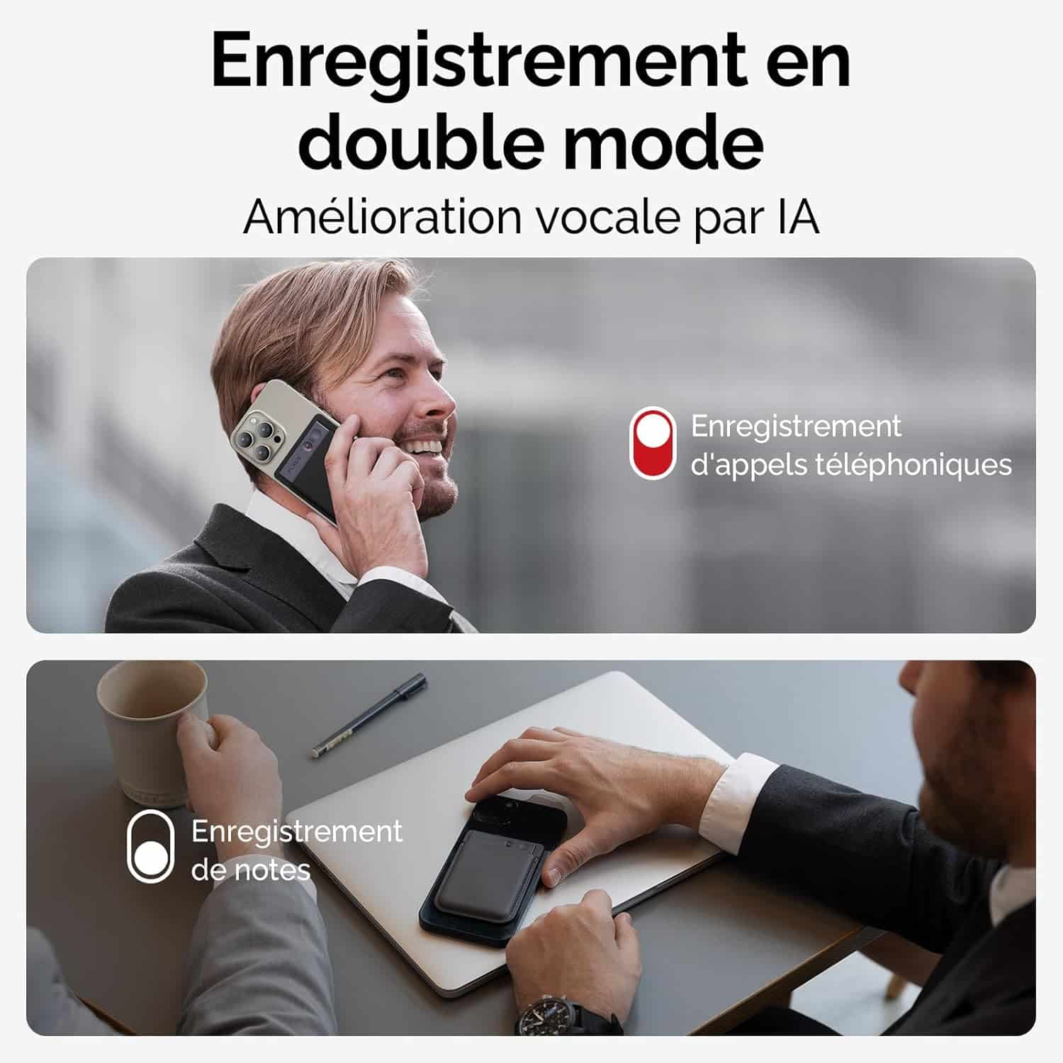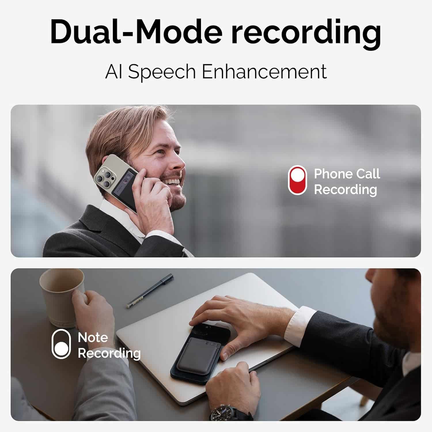 With dual-mode precision recording, the air conduction sensor captures crystal-clear ambient sound during meetings and presentations, while the Vibration Conduction Sensor (VCS) ensures accurate call recordings directly from your phone’s internal audio.