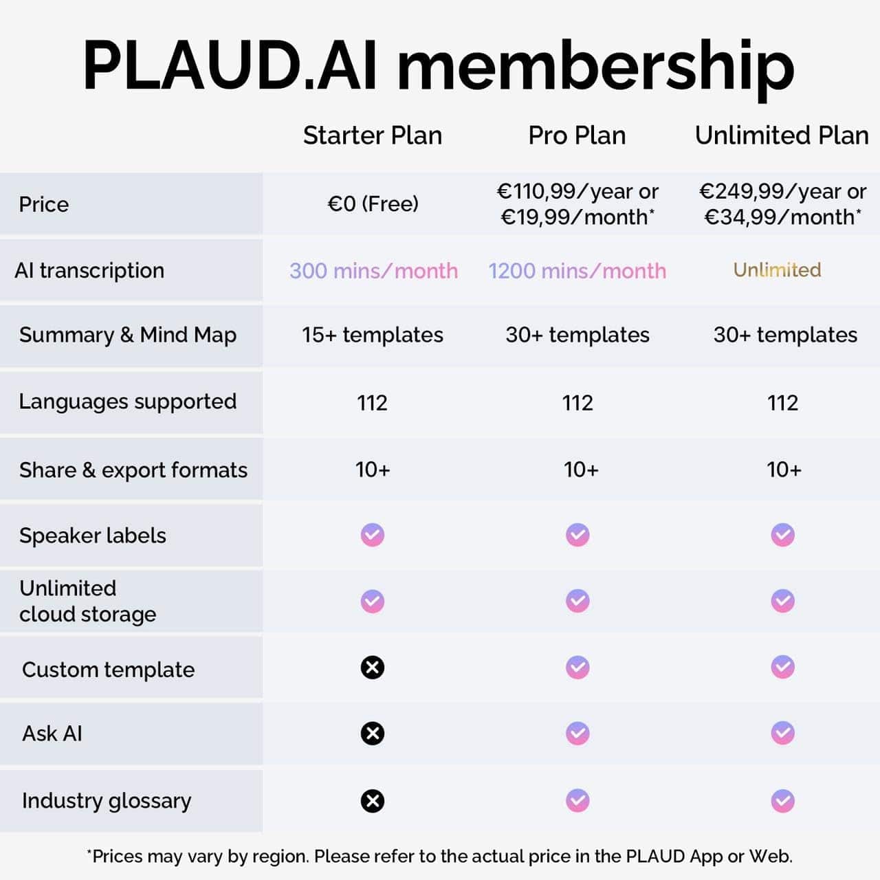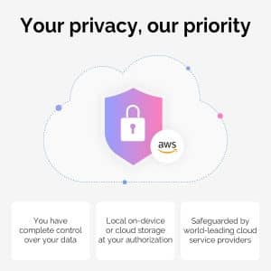 Your privacy is safeguarded with encrypted local storage and cloud access available only with your authorisation. The PLAUD App and Web Portal provide unlimited cloud storage, AI transcription, speaker labelling, file management, and audio trimming.