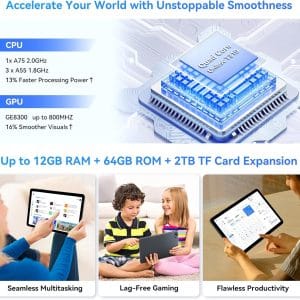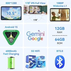 TABWEE GEMINI-AI-Installed Tablet Android 15 Android 15 Tablets, 10.5 inch Tablet with HD+IPS Display, 12(4+8) GB RAM+64GB ROM/ 2TB TF, Gemini AI 2.0, GPS, 5G WiFi, 2.0GHz CPU & 5MP Camera, 6000mAh, GMS Certified
